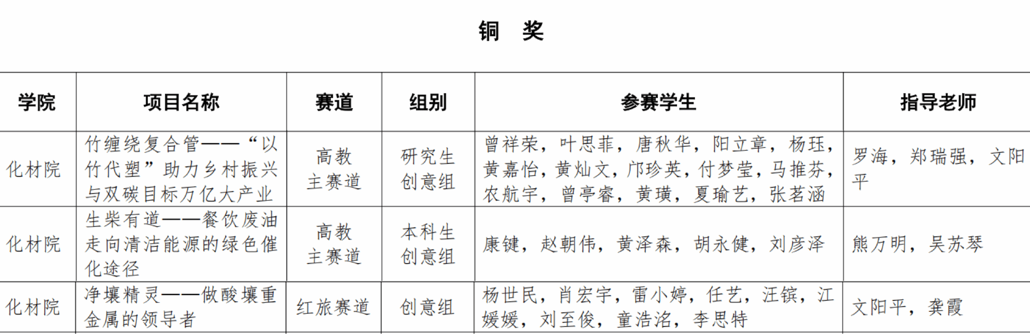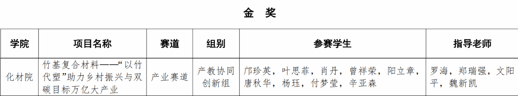《竹基复合材料——“以竹代塑”助力乡村振兴与双碳目标万亿大产业》项目荣获产业赛道产教协同创新组金奖;《竹缠绕复合管——“以竹代塑”助力乡村振兴与双碳目标万亿大产业》、《生柴有道——餐饮废油走向清洁能源的绿色催化途径》和《净壤精灵——做酸壤重金属的领导者》三个项目分别在高教主赛道、红旅赛道斩获铜奖。