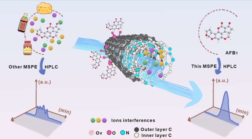 针对磁固相萃取(MSPE)在高盐基质中易受离子干扰、萃取效率衰减的技术瓶颈,团队创新提出“牺牲位点工程”策略,将功能化碳基吸附剂与离子调控概念结合。该吸附剂通过氮掺杂、氧空位构建离子缓冲中心,同时以羟基表面层强化目标物相互作用,实现离子吸附与目标结合的功能解耦。优化后的 MSPE 系统在 0.1 mol/L NaCl 条件下仍保持 90% 以上效率,耐盐性较传统材料提升 4 倍;应用于高盐食品中黄曲霉毒素B1(AFB1)痕量检测时,回收率达 99.7%–108.2%,检测限低至 16.0 pg/g,性能远超商用吸附剂。该研究建立了 MSPE 离子调控通用方法学,为复杂高盐基质痕量分析提供了高效解决方案,彰显了永利集团88304官网在分析化学领域的创新实力。