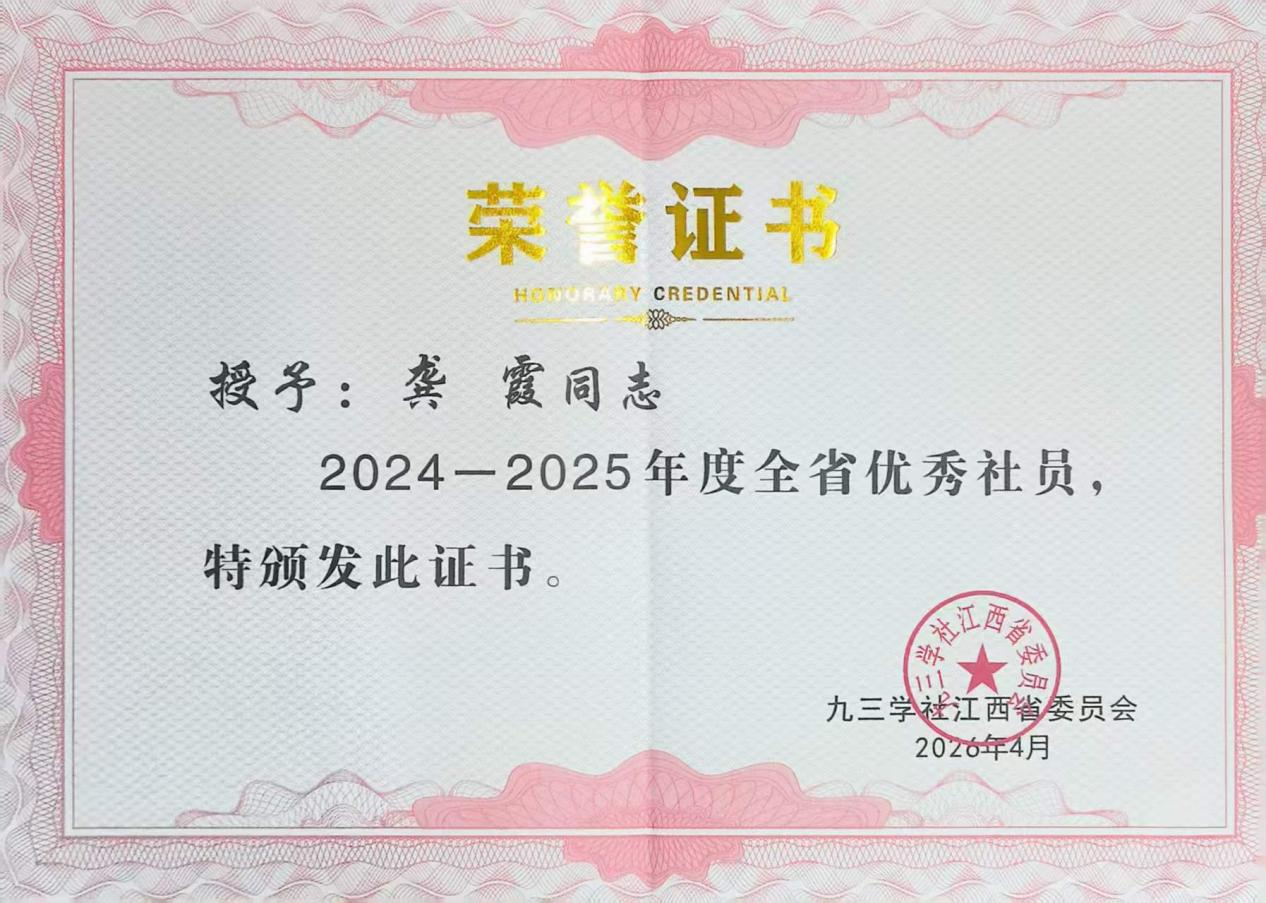 2026年4月1日,九三学社江西省委员会下发《关于表彰2024-2025年度全省优秀社员和社务工作者的决定》,表彰了150名先进个人,永利集团88304官网龚霞教授荣获“全省优秀社员”称号,这是对其立足岗位建功立业,履职尽责担当作为的认可和鼓励,也是对永利集团88304官网统战工作和人才队伍建设成效的肯定。