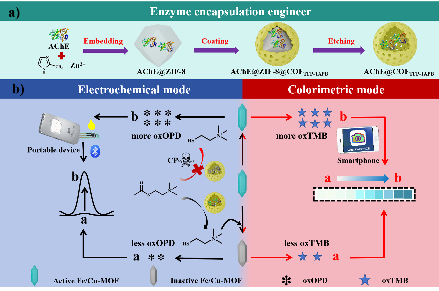 乙酰胆碱酯酶(AChE)抑制策略已成为检测有机磷农药(OPs)的有效方法。然而,AChE极易受到非温和环境条件的影响,导致传感性能显着下降。为了解决这一限制,在这项工作中,设计了AChE@COFTFP-TAPB纳米胶囊,以ZIF-8作为牺牲模板将AChE封装在空心共价有机框架(COF)中。COF将为AChE提供一个刚性外壳,以保护AChE免受非温和环境的影响(65°C、pH<4.0、有机溶剂),这极大地增强了其环境耐受性。同时,COF中空的微环境能够保持AChE的构象自由,保证其较高的催化活性。因此,通过将AChE@COFTFP-TAPB 与具备类过氧化物酶活性的Fe/Cu-MOF结合,构建了一种便携式电化学/比色双模传感器,用于高灵敏地检测毒死蜱(CP)。与先前报道的CP传感器相比,我们提出的传感器在电化学/比色模式下的检测限分别为0.3 pg/mL和1.6 pg/mL。值得注意的是,即使在恶劣的环境中,传感性能也与最佳条件下的传感性能相当。这项工作提供了一种通用的基于AChE抑制的传感器,用于灵敏可靠地检测不同复杂环境系统中的农药残留。