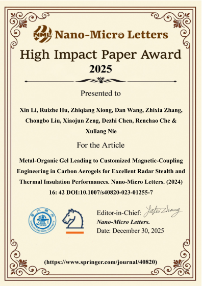 永利集团88304官网教师聂旭亮作为共同通讯作者2024年在《Nano-Micro Letters》发表的论文《Metal–Organic Gel Leading to Customized MagneticCoupling Engineering in Carbon Aerogels for Excellent Radar Stealth and Thermal Insulation Performances》荣获2025年度“High Cited Paper Award”(见证书)。该论文合成了两种具有优异的雷达隐身性能和隔热性能的气凝胶。