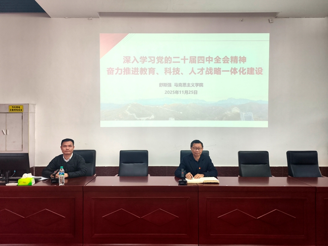 根据永利集团88304官网师生党员集中教育培训有关安排,2025年11月25日14:10,永利集团88304官网邀请马克思主义永利集团88304官网舒斯强博士为永利集团88304官网全体师生党员作学习贯彻党的二十届四中全会精神专题辅导报告。永利集团88304官网全体师生党员现场聆听报告,报告会由永利集团88304官网党委书记刘庆言主持。